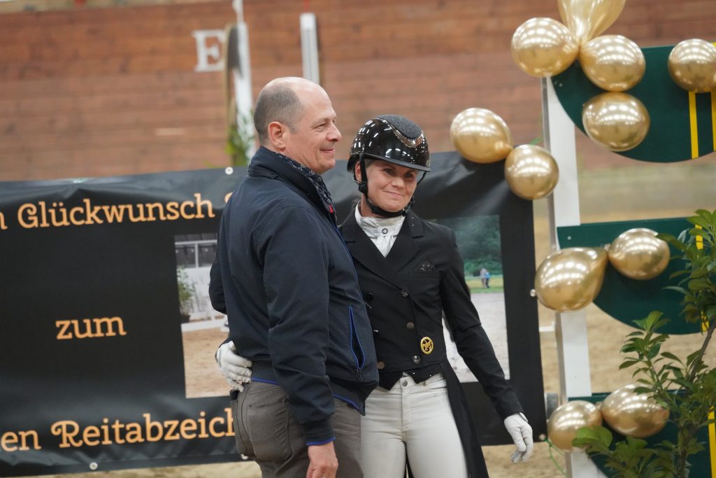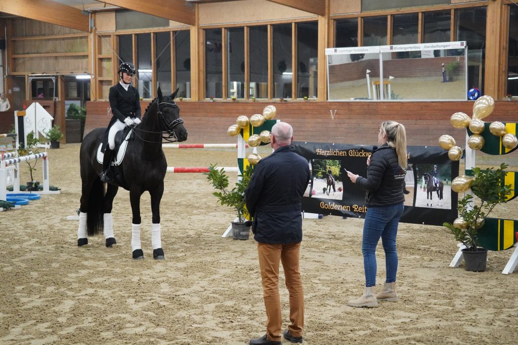 Am 07.03.2026 war es dann soweit: Auf dem Frühlingsturnier ihres ZRFV Coesfeld/Lette e.V. bekam Stephi 🇨🇭 aus den Händen des Richters, der auch ihr langjähriger Trainer ist, Herr Christian Wendel Ihr „Goldenes“ verliehen. Mit ihrem selbst ausgebildeten Pferd 🐴 DE FUNES 🐴 sammelte sie in den letzten beiden Jahren die nötigen Siege und Platzierungen in den Klassen S* bis S***. Zur Verleihung am Samstagabend kamen neben ihren Reiterkollegen auch viele Freunde und Familienmitglieder, auch aus ihrer schweizer Heimat 🇨🇭 .